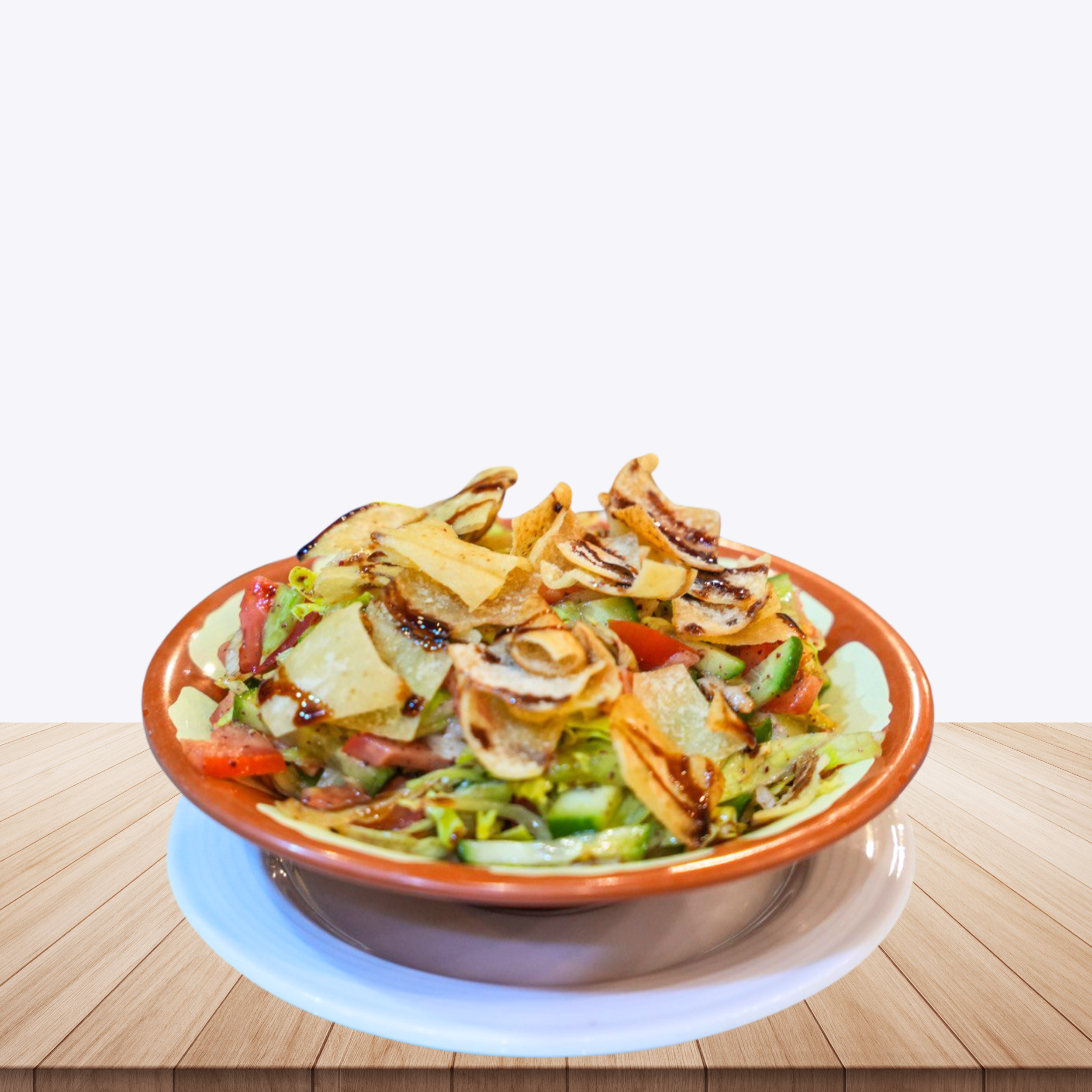 Made with fresh vegetables- herbs and toasted pita bread. Our Fattoush salad is made with crisp lettuce- tomatoes- cucumbers- onions- parsley and mint- making it a perfect side dish or a satisfying light meal.